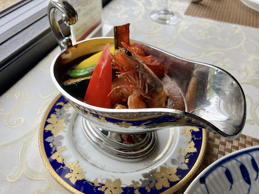 【シーフードカレーセット(2200円)】※サラダ、シャーベット、珈琲付。 初めにサラダが出てきますがこのフレンチドレッシング美味しいな~ ベジファーストしたらメインの欧風カレーのご登壇♪ 綺麗なお皿にライスが提供されカレーポットに豪華なシーフードカレー♡ なんて美しく豪華なんだ!? パッと見ただけでも野菜の素焼きであったりボイルであったり~ 海老ちゃんも軽めにローストしてありますね。 ライスにカレーをかけて頂いてみると~ふわぁっと優しい味わい♡ しっかり煮込まれた野菜やフルーツの優しさに海鮮の旨味が良いな。 海老だけでなく烏賊、帆立に白身魚も~本当に豪華で価格に見合っている。 スパイス感は、控え...