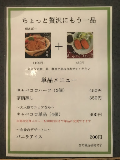 こちらの名物は生姜焼き丼と キャベコロ(キャベツコロッケ)だそう 生姜焼き丼は以前食べた際美味しかったので キャベコロ定食にしようか迷いましたが 結局決めきれず両方行くことに(笑) ということで 生姜焼き丼(並)でご飯を半分に キャベコロを単品でお願いしました。
