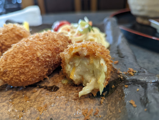 続いてキャベコロが到着! 中があっつあつということで割ってからいただきます。 箸を入れるとザックザクという快音がする揚がり具合! 御開張するとクリームコロッケのようにトロっとした 具が出てきます。 ソースをつけていただきましたが 田原産のキャベツはとても甘くて柔らかく 混ぜ込まれたカレーの風味がより 甘みを引き立てているようでした! ちょっとカレーパンの感覚に似ていますね! この具でカレーパン作っても美味しそう!