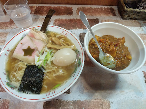 Read more仕事で当地を訪れた際にランチ利用。同様の12時20分、前客0、滞在中に後客1名。 この日は中華SOBA+肉増し(1枚)+味玉*ミニカレーを食す。600円+100円+50円+200円とすこぶるリーズナブル! 待つこと10分くらいで提供。ラーメンは醤油味?ベースは何でしょう?何かが主張する事無い、なんとも掴みどころのないスープ。麺は自家製麺でしょうか?細目で平べったい縮れた麺で、どこかカップヌードル的。具材はメンマ、大きく刻まれた長ネギ、小さい海苔1枚、昆布を星型に切った物にレアチャーシュー2枚と味玉。 カレーは家で食べるような家庭的なカレーで野菜が沢山入ってます。カレー風味が強い訳でもなく、スパイシーでもなく、辛さも無く…こちらも掴みどころないカレー。 どれも独特で個性的。お店の立地、雰囲気、お店の方の応対と...