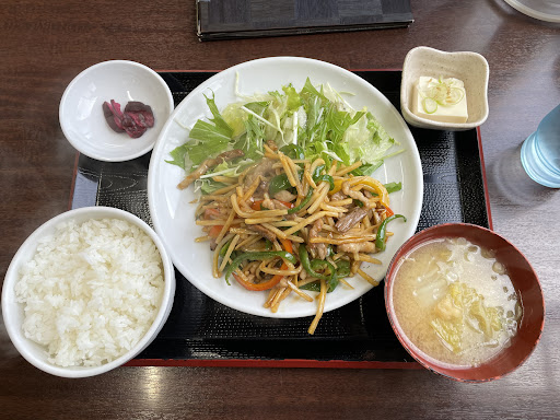 チンジャオロース自体がかなりのボリュームで驚き、脇には水菜をメインにしたサラダが添えられています。別皿で小さな冷奴、漬物、味噌汁、ご飯が付いてきます。