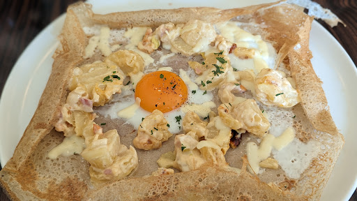 昼過ぎに夫婦で伺い、トマトとアンチョビ、小エビ、お肉、じゃがいものグラタン風の2種類のガレットと、ハチミツレモン、りんごとラムレーズンの2種類のクレープを頼みました。 ガレットは好きで他の複数のお店で食べたことがありますが、こちらのガレットは端がしっかりと折られているわけではなく、また非常に薄く仕上がっていました。そのせいなのか大部分がパリパリとした食感で軽く食べ易く美味しかったです。特にトマトとアンチョビのガレットが好みでした。 クレープはメニューによって包み方や薄さ?を変えているのか、ハチミツレモンの方はサクサクとした食感の部分が多く、りんごとラムレーズンの方はもっちりとした食感でどちらも美味しかったです。 夜のメニューも美味しそうでしたので、機会があれ...