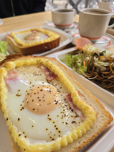 月見トーストは、メニューの写真だと月見トースト・サラダ・ソーセージのセットですが、ソーセージが焼きそばに変更されています。 肝心の月見トーストは、カリッと焼かれたパンにしっかり焼かれた目玉焼き、その周りを囲むようにマヨネーズ。