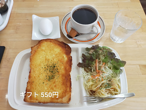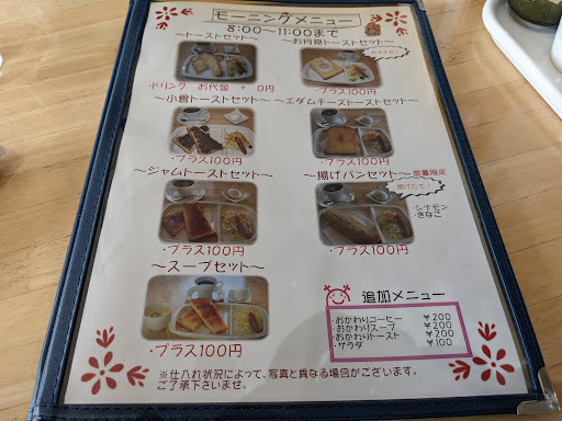 モーニングは トーストセット ドリンク代のみ 小倉トーストセット ドリンク代+100円 ジャムトーストセット ドリンク代+100円 スープトーストセット ドリンク代+100円 お月見トーストセット ドリンク代+100円 エダムチーズトーストセット ドリンク代+100円 揚げパンセット ドリンク代+100円 ピーナッツバタートーストセット ドリンク代+100円 が有ります。