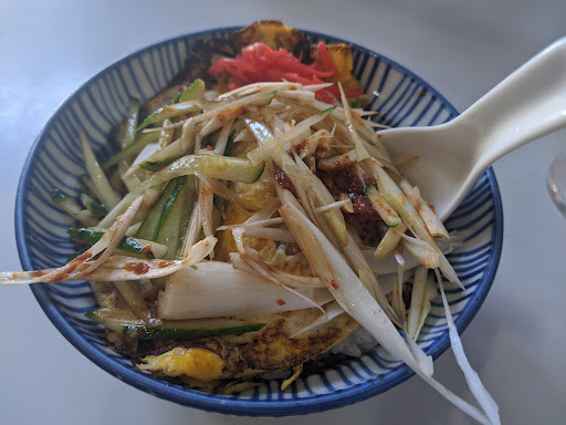 ネギ辛丼はご飯の上に玉子焼き、その上に白髪ネギとキュウリを豆板醤で和えたようなもの、紅生姜が載っています。 ラーメンのセットには悪くないですね。