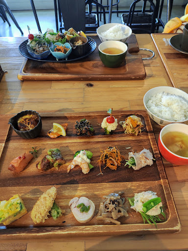 Read moreクチコミを見て、平日に早めに入店。既に3組座っていてました。 11時10分前に注文し、セットドリンクを先に出してもらって30分にドリンク、料理は50分に配膳されました。 ごはんはふんわり盛りで、ちょうどよい量。半分に減らしてもらえば良かったと言っていた母も完食。 スープは角切りの野菜と鶏肉が入ってやさしい味わい。 15種類のプレートランチ、お酒のおつまみに欲しい見た目ですが、おつまみのように味濃くなく、身体が喜ぶ食材と味付けで美味しかったです。 母の頼んだ15種類のワンプレートは、盛り付けが簡略されてましたが料理はほぼ一緒のようでした。 カレーや天ぷらなど、温かい状態で配膳されたので、盛り付けにこだわり時間がかかるのは仕方がないかな。 12時過ぎには混み出して待っているお客さんがいたので、食後はすぐに退席。 先にドリンクを頼んでゆっくり飲んで待ってたのは正解でした。 店前の駐車場はいっぱいで平...