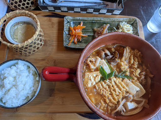熱々の鍋にインスタント麺がほぐされもせず入っているスンドゥブチゲ。 ライス、ナムル、茶碗蒸しっぽいもの。