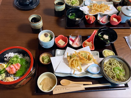 お食事は天ぷらがサクサク、おかず類は 美味しかったですがちらし寿司が 個人的にいろいろ入りすぎて残念でした。 じゃこと桜海老が多すぎなのかな? 桜海老も見た目華やかになるし 良いとは思ったのですが食べてみたら 口の中が少し喧嘩するような😂