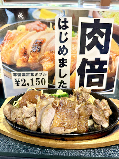 お目当ては先日多可町さんがインスタでアップされていた車留満定食の『肉倍』。これ、地元名物の播州百日鶏のチキンステーキなんですけど、普通の倍の量があるとのこと!