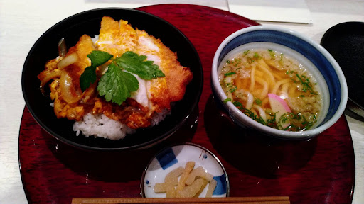 ゆめタウンの一角にあるお店です。店内は中高年のマダムな顧客が多く感じられます。テーブル席にはアクリル板が設置され感染対策をされていて安心ですが、横の席が近いので少々気になります。コロナ以来、少人数の店員さんで切り盛りされているお店が多いですがこちらも店員さんが走り回っていて忙しそうです。メニューを見ると和定食を色々揃えていらっしゃいますが、一番人気と書いてある「かつ丼」と小うどんをお願いします。気長に待つこと少々でお盆が到着。うどんはモチモチ柔らかく手延べ風で美味しいです。豚カツは厚みのある良いお肉を使用されている感じです。かつとじは薄味で上品な味付けですが後半少し満足感到来。お値段は少々高めに感じますが、美味...