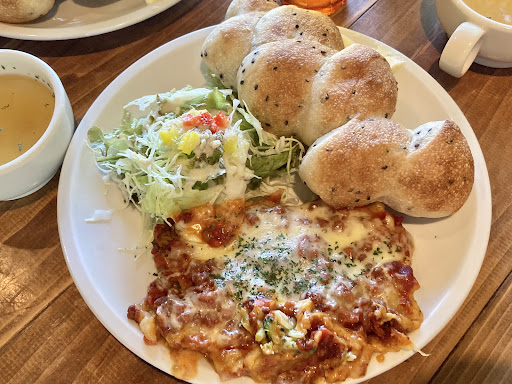フレンチトーストのモーニングも、ラザニアとパンのランチも美味しいです。 ラザニアと自家製パンのランチセットは、ドリンク込み¥1320。 ミートソースに、ナスやブロッコリー等その時々の野菜の入ったラザニアです。 窓のある南側には、ほどよく手を入れ過ぎていない庭が広がり、夏には入口足下に蚊取り線香が焚かれているのも風情があっていい感じ。 いつ行っても子どもがいない(子連れさんにはゴメン!)のも、これまたいい感じ。