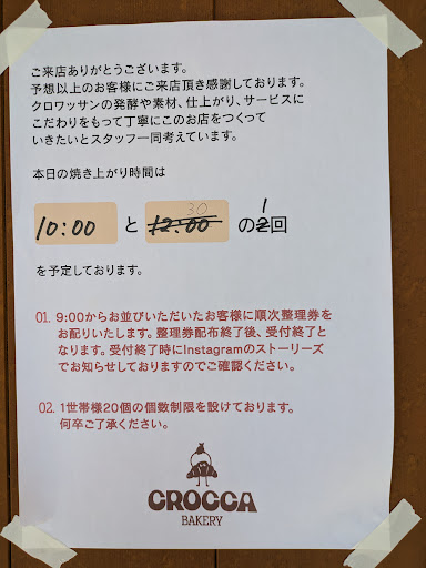 ミニクロワッサンは10時と11時半に焼き上がるとのことで、11時半焼き上がり分を目当てに並びました。 しかし列はほとんど進まず、12時前になってようやく「クロワッサン売り切れです」と突然の告知。 それまで何の案内もなく並ばされていたお客さんは皆、呆れた様子で一斉に帰っていきました。 店頭に並ぶ個数はある程度読めるはずなのに、購入個数を事前に聞くなどの対応や、もしかしたら列の後方は完売するかもという事前アナウンスもなく、一方的に完売を告げられ、列に並んでいた1時間を返して欲しい気持ちになりました。