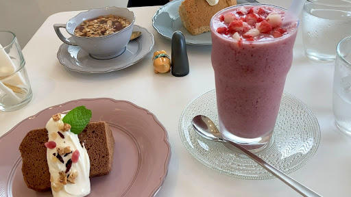 シフォンケーキにはティートが散りばめられ、単調とも思えるスポンジの味わい花が添えられる...