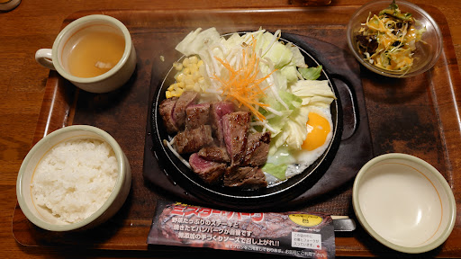 旦那が以前会社の人と来て美味しく安かったので、今度は家族で行こう!と言うてたので家族で行きました。机がベタベタの為、腕や手を置けません。子供2人にはお子様セット頼んだ所、娘がフォークの後ろがベタベタする〜と言うて、手洗いの所で洗いました。油だらけなので、床もベタベタした感じです。まぁ鉄板で出てくるので、油が飛び散り仕方無いかと…。 旦那ステーキ、長女ハンバーグ、私はカルボナーラ注文しましたが、ステーキ肉柔らかいけど、作った肉って感じの味がします(成型肉?って言うんかなメニューちゃんと見なかったけど)。ハンバーグもイマイチ、カルボナーラもイマイチ…チーズ振りたかったけど無かったです。 で、旦那が野菜が不味いと言うのでキャベツを食べたら不味かったです。ソースの味なのかなぁ〜美味しくない時期の白菜の味がしました。 ビール生大は1Lで1000円弱、ゴクゴク飲みたい人は良いかと…。アイスは美味しかったです。値段も5人家族で5000円弱で安い方と思います。店員も良い感じです。 ただ、家族揃って二度行き...