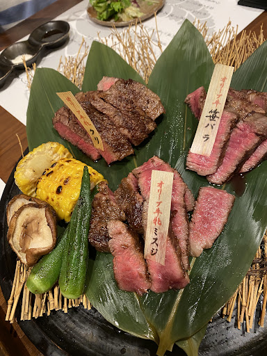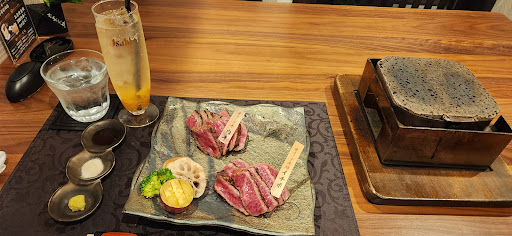 Read moreWas travelling in the area and specifically stopped by this location to try out olive black wagyu. Of course I'm not a 5-star chef, so I can't pin point exactly what tastes are defined by their olive diet. The experience was exceptional from start to finish, even for a solo traveller, during lunch, that only speaks English. I got the 200g comparison set, which turns out to be one section from the thigh and one section from the hip. So you're comparing textures as you can expect, with the heated rock there to let you experiment with done-ness. The bit of real wasabi and/or salt is there to change up the taste. The hip section as pictured on the right was as tender as expected of japanese wagyu; on par with tenderloin from other regions I've tried. A placard at the table certifies details on the cow's lineage if that's your thing. In the end, the sampler was perfect for a higher class lunch if you're looking to try...