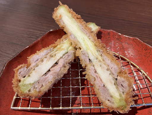 案内の際に限定メニューをお薦めされたので注文してみましたが、とても美味しくてビックリしました メニュー名は失念してしまいましたが、レシートには「なすかつ」と表示されていました うろ覚えですが「美ーナス」という茄子をお肉で巻いた商品だったと思います 茄子の見た目があまり火が通ってなさそうに見えましたが食べるとトロトロで柔らかく、豚肉とピリ辛ソースとの相性抜群でした 写真の量で1個分の量です