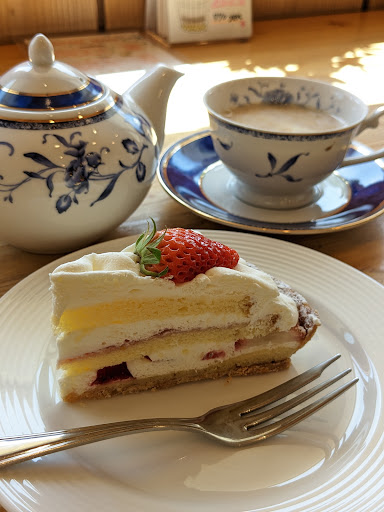 私はいちごショートのタルトをケーキセットで。 娘はダブルチョコのタルト。 セットはコーヒーか紅茶が選べて1000円。 紅茶はポットで出してくださり、カップにたっぷり2杯いただけたので、このお値段はお得だと思います。