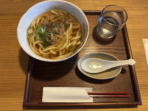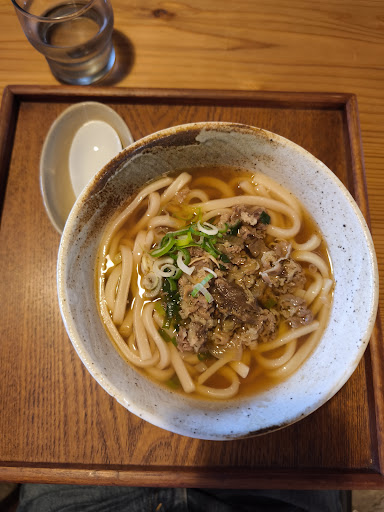 Para beber tienen bebidas varias incluyendo zumo de naranja o chocolate caliente. Todas por 550 yenes. Y de platos para comer tienen unas 4-5 opciones (bastante variado y una de ellas era udon de raíz de bardana lo cual está bien si no comes carne). Los platos oscilan entre los 800-900 yenes. Nosotras pedimos el udon de carne y estaba delicioso! Uno de los mejores que he probado nunca. No dejamos ni una gota jajaja