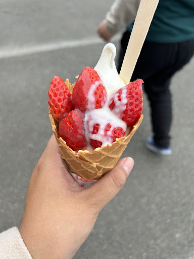 ソフトクリームは牛乳の味がしっかりしていて、新鮮なイチゴは香りも良く、コーンまで手作りで...