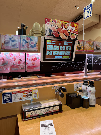 Read more初めての訪問。 一番、キッチンに近い席にすわりましたが。 ・キッチンのアルバイトの私語の多さにビックリです。 友達同士なのか、ずっとしゃべってます。 外まで聞こえてます。 仕事の内容以外の会話。 ・タッチパネルで注文した商品はなかなか来ない。 ・私達の席の色のお皿で頼んでもないサーモンが何周も回っている。 ・違う席の色のお皿にパフェがずっと回っている。 アイス?クリーム?がドロドロに溶けてました。 普通はキッチンに、戻ってきた時点で下げるなり、お席に、持って行きませんか? 日曜日の21時頃の訪問でしたが責任者がいなかったのかわかりませんが、あまりにも教育がなってないアルバイトばかりでビックリでした。 宮崎市の店舗ではこ...