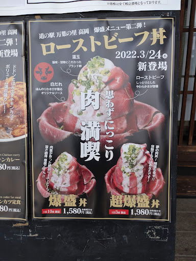 普段から道の駅に行くことがあまりなかったのですが、少し前から爆盛りが一日○食限定であることを知り、是非挑戦したいと思い、お邪魔しました。 道の駅だけあってフードコーナーのメニューは豊富で、お客さんも多く、席がほぼ満員で、席ごとにはアクリル板が置いてありました。 爆盛りメニューはチキンカツ定食、チキンカツカレー、オムライス、ローストビーフ丼とあり、入ってすぐの入口にはそれぞれ爆盛りメニューの説明が書いてあり、シェアして食べることも出来るみたいでした(^^) 自分は1番気になった超大盛りローストビーフ丼(1日3食限定、11時~14時)をお願いして、説明書き通りのボリュームで、味も美味しかったです☆ 爆盛りあるあるで、半分程食べると味に飽きて来ますが、上にのっている温玉や、付け合せのタレで味を変えながら最後まで美味しく、無事完食に成功しましたᕙ( ͡° ͜ʖ...