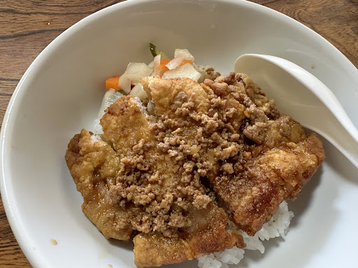 Read more高岡市内の少し道に入った所にある人気中華屋さん。ここではロース丼やロースラーメンをはじめ、定番の餃子、チャーハン、肉だんごなどの中華が味わえます。今回は前から気になっていたロース丼を注文♪ ロース丼は豚肉をカラッと揚げたものがご飯の上に乗っており、その上から甘めに味付けされたそぼろが乗っている丼でした。豚肉を揚げたパーコーは中はジューシーだか、周りの衣はカリカリのため食感も楽しめます。また、甘辛く味付けされたそぼろとご飯にかかった甘めのタレがパーコーの衣に絡んでとても美味しかったです。丼にはピクルスがついており、箸休めに最適でした😁 スープは醤油ベースで〆に優しい味付けになってます。別でシュウマイも注文しましたが、シュウマイは中身が柔らかいタイプでエビがプリップリでした!柔らかめのシュウマイが苦手な人は注意です⚠️ 最近台湾に行ったばかりだったので、台湾料理に似ているロース丼は...