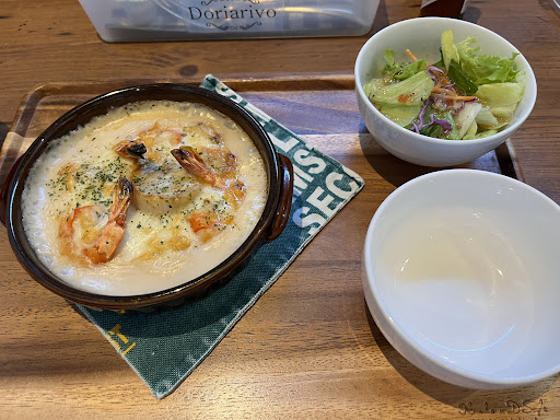 シーフードドリアを注文しました。 お値段は「1200円」とドリアにしては少し値が張る印象。 ご飯はピラフ仕立てにしてあり、その上にイカが混ざったホワイトソースとチーズがかかっており、1番上にエビ3尾と大ぶりのホタテが1個のっています。