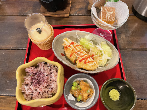 創作料理と家庭的な料理で、自分では面倒で作らない料理もあり、デザート飲み物付きで¥1650は、値打ちがあり満足でした。 メニューは月替わりで1種のみ