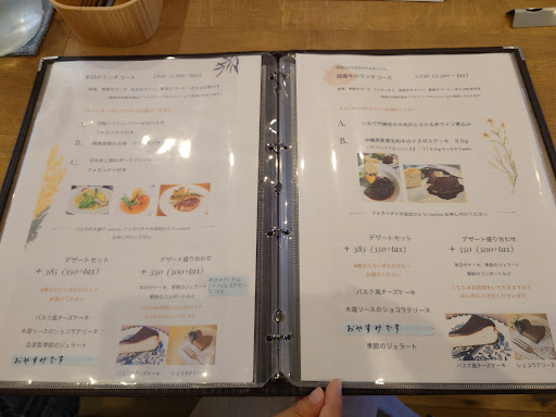 ランチとディナーが楽しめます。 私はランチで行きましたが、マスターお一人でした。 メニューはコースが二種類 1種類は前菜、スープ、フォッカ+メインを3種から選び、ドリンクが選べます。 1種類はメインがステーキのコースでした。 どちらもお好みでデザートも追加できます!