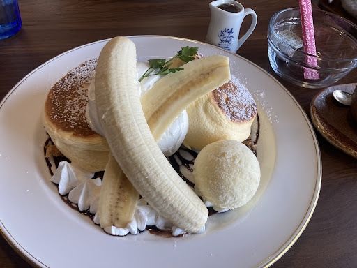 まるごとチョコバナナパンケーキには、メイプルシロップ。 あんバターパンケーキには、抹茶ソース。 3月現在で販売されている、いちごスフレパンケーキには、いちごソースがついてきます。 パンケーキと一緒に、飲み物を頼むと、飲み物代が半額になります。 パンケーキ❣️目でも楽しませていただき、食べて大満足❣️ やっと食べれて良かったです☺️