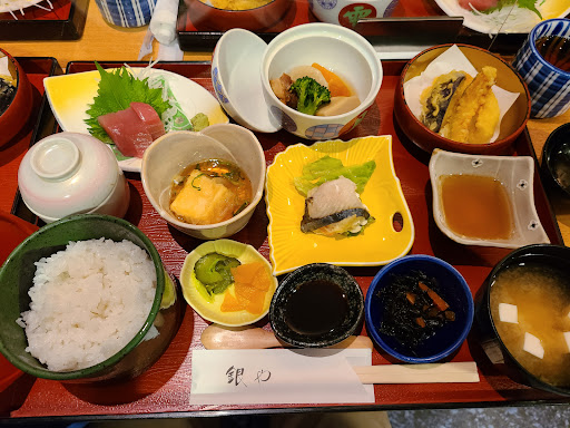 再訪です。 今回は六味をいただきました。 煮物や天ぷら、焼き魚に焼肉(ステーキ?)と色とりどりのおかず。 食後はコーヒーかシャーベットを選択できます。