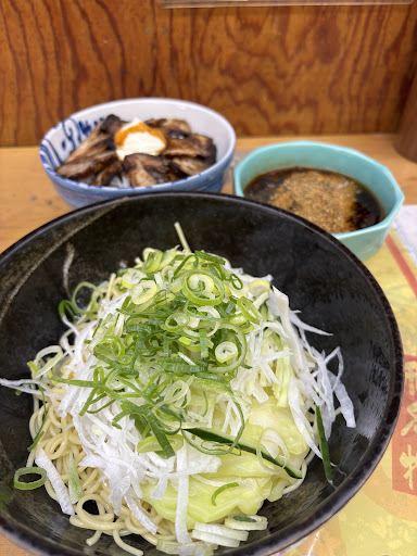 Read more広島つけ麺 チャーシュー丼セットいただきました 広島つけ麺?初めて聞いたつけ麺 どんなかなって思ってたら、おお?コレがってなりました 冷麺の様な麺で大根の千切り、きゅうり、ネギ、レタス、チャーシューが乗っかてまして、ちょいピリ辛のスープにつけて食べます ラーメンぽくは無く、どっちかというと冷麺ぽい感じです チャーシュー丼は香ばしいチャーシューが乗ってます、ちょい苦味のあるタレがかかってました ちょい変わったつけ麺でした 車は駐車場が横...