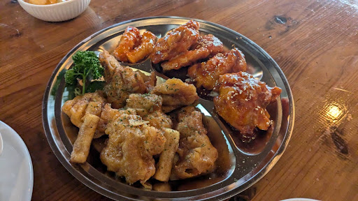 Lots of good sauces for their chicken, which they fry with just batter rather than breading it. Also the chef is Korean, so you can request to dial the spice up to Korean-levels for anyone interested. I recommend adding the fried tteokbokki topping no matter what chicken you order.