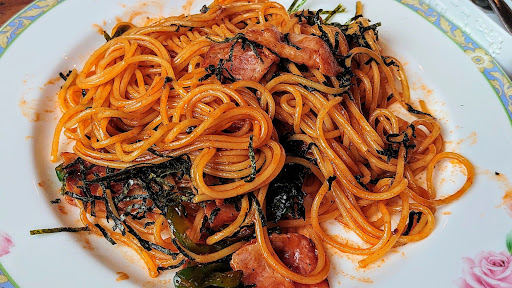 三度目の訪問、べた褒めな口コミのツナと大根おろし和風パスタが気になっており、本日挑戦。見た目は極普通なシンプルさ。皿の周囲に刻んだ水菜、細めなパスタにツナが纏わりつき、多めな刻み海苔がトッピング。割り箸で全体を満遍なくまとめて頬張る、塩コショウが効きサッパリなのに奥深い味。夢中で食べ短時間で完食。パスタ大盛ではまりました。