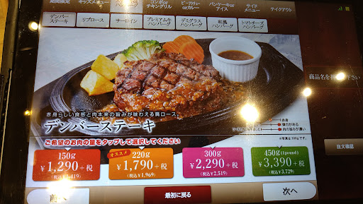 気を良くし二回目のランチ ランチデンバーステーキ。 250グラムにしてライスをカレーライス大盛りで、サラダもつけてしまった!@1490税込み 味付けは前回と同じそれなりですが価格から考えるとコスパはかなり良いと思います。 何故か前回より50グラム大きな肉が小さく感じました。 オプションのサラダはガストの倍くらい、ミニカレーライス大盛りは大きな肉も入ってかなりオススメ、次回はビーフシチューを食べてみたい。