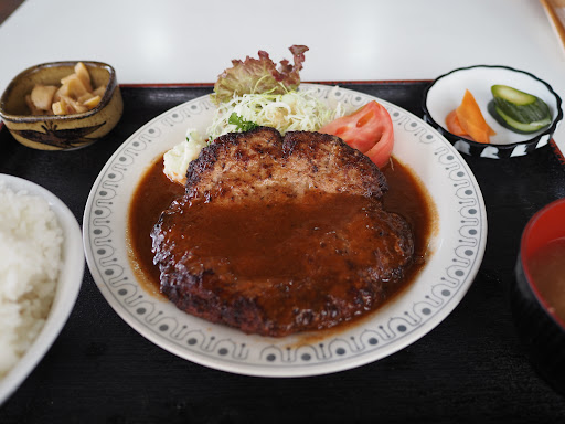 ◆ジャンボハンバーグ定食(1,500円・税込) 運ばれてきた瞬間「おぉ!」となる、300gの立派なハンバーグ。 柔らかくて食べやすく、まさに王道の味☆ デミグラスソースはコクがあり、ご飯が進む系のしっかりした味わいです。