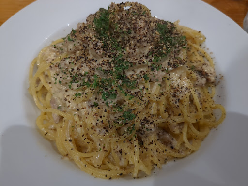 Read more友人の勧めで寄ってみたが・・・。ペペロンチーノ系が得意?なのか開いたメニューページの一番上に来たので本日取れたて野菜のペペロンチーノって言う新鮮そうなメニューを選びBセット(サラダ+ドリンク)を注文。先ずサラダが出てきたので早速食したところ、ドレッシングがまんべんなくかけられていて結構しょっぱい💦後で店先のポスターにオリジナルドレッシングとして販売していたくらいなので余程自信があったのだろうか。ちなみにサラダの量は結構多め。程なくしてメインのパスタが出てきたが、取れたて野菜がなんなのか見てみたらなんと白菜。。。それに白い角状の野菜がゴロゴロと入ってたので食べたところ、どうも大根。。今まで色んなパスタを食べてきたが、白菜と大根が入ったパスタは正直初めて。食感はシャキッとしてていいのだが、どうにもチープさは拭えない。麺の方はかなり硬い。悪く言えば少々茹で足りない?くらいの硬さで、あまり好みではないというより食感が美味しいに結び付かない硬さなので何とも・・・。ペペロンチーノだから辛いっていう常識はある程度もっているが、ここの辛さは少し過剰なレベルでその証拠に輪切りされた鷹の爪がこれでもかっ!ていうほど散りばめられている。 加えてガーリックがかなり効いてて食べてる途中で、自分の吐く息が臭いなと思うくらい麺に絡められていた。 以上で味が濃い目が好きな人には大うけするパスタ屋さんだが、小さいお子さんやアッサリしたパスタが好きな人には向かない。 店内の周りにいたお客さんもどちらかというと40代後半~60代くらいの年配の方々が多い。 店内の印象としては、少し汚れが目立つ。床もキッチンとテーブル席が近いので割と油ぎってってラーメン屋かと思うくらい靴の裏が貼りつく感じ...