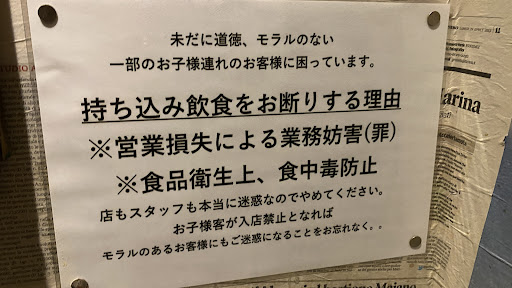 2回目の来店だったが、初回に幼児の離乳食と飲み物の持ち込みについて事前に確認したら、離乳食はOKだが子供用のジュースはダメだと言われたので、子供用のマグに水かお茶を入れて持ち込むのかもダメかと聞くと、オーナーの確認が必要とのこと笑。お水はでも無料で提供されてますよね?ミネラルウォーターを飲ませたいのでと言うも、確認が必要とのことで、折り返しがある。