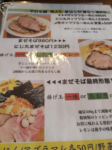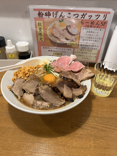 Read more初めて伺いました。 店先におすすめが書いてあり、見てました。3種類のチャーシューが乗ってるものが数量限定でありました。 お店に入りカウンターでメニューを見てやはりそのおすすめのものがよく、聞いたらあるとのことでお願いしました。 粉砕ゲンコツガッツリラーメンです! 前金で1500円です。 麺の量は選べますが250グラムにしておきました。300グラムまで大丈夫とのことでしたが経験上食べれない可能性があります。 ニンニクは大丈夫か聞かれます。もちろん入れて頂きたいです!