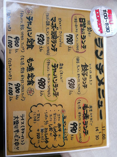 Read moreお昼を食べに行きました。 ランチメニューはメニュー表にある通りですが、日替わりランチは10食限定ですが食べることができました。 780円とリーズナブルです。 ラーメンが付きますが、醬油でも味噌でも価格は同じです。 味噌ラーメンは、味噌に特徴があるというような感じはしませんが、味噌だなあという味でしょっぱすぎる程ではありません。麺は醤油よりは太いですが、太すぎるということはなく、ほかラーメン屋さんではもっと太いことが多いような気がします。 ラーメンの量は、普通の1人前のような気がします。 凄く美味しいとは言いませんが、普通においしいと思います。 ただ、座敷は少し狭くて窮屈なのと、お昼時は駐車場...
