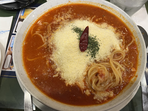 A local mentioned to me that a food Takasaki is famous for happens to be spaghetti. This restaurant serves spaghetti in Takasaki style, which is a very watery sauce, nearly the consistency of soup. The menu has a lot of variety, many items have various seafood included. When you order you can choose fresh noodles or "dry packet" noodles and select a size. Fresh noodles are about 100yen more. They also have various sets that include bread, salad and drinks.