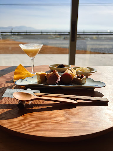 Read more前から来たいと思いながら立ち寄った時は何時も満席で来れなかったお店です。 あえて小雨☔️だったので大丈夫かな?と電話したら予想通り入れました。 新しいせいもありますが、とても綺麗で落ち着けるお店、大きな窓からは琵琶湖と青空(今日は小雨🤣)がいっぱいにひらけて絶景です。 ご夫婦かな?仲の良いお2人でされているようです。 お席はカウンター4、2人席2、4人席2.奥に個室も見えました。 さてランチにお邪魔したのですが、お昼はランチコースのみで3種類から選べます(日によって違う?) 撰ぶ時は少しお高めに思えますが、自家製野菜や地元の野菜を使われていて、どれも手の込んだ料理でひと口ひと口がとても満足できるお料理でした。メインがコース種で選べ、わたしは肉(近江牛の冷しゃぶ)で相方は魚(ビワマスの炙)を選びシェアして頂きましたが、これもどちらも美味しい。ご飯も土鍋で焦げも頂けて、とても良い時間を過ごさせて頂きました。 またぜひ来たいし、客人友人などを接待する時にも使うお店にしたいですね。 朝やディナーも期待!お勧めですよ。 ただ満席の事が多いのでインスタから予約されるか電話でも聞いて頂けるので事前確認必須うかと思います。 あと湖岸道路からの入り口がわかりにくいのでナビ気をつけましょう、駐車場入口に青い旗があります。...