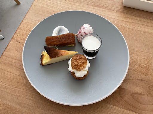 左上から ◆タルトタタン、ヨーグルトソース ◆ストロベリークリームチーズのジェラートとバニラクランブル ◆ジュレドカフェ ◆パイナップルとココナッツのシューアラクレーム ◆濃厚バスクチーズケーキ