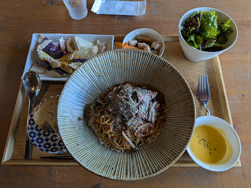 Read more店内はとても落ち着いた雰囲気で窓から見える風景とマッチしています。 ランチはメイン料理と野菜料理、サラダ、スープでした。 どれも一つ一つ丁寧にこだわりを持って作っているのがよく分かり、とても美味しかったです。 特に野菜は新鮮で種類も多く、味つけも最高でした。(ニンジン嫌いの自分でも美味しく食べれました) 色あいや盛り付け、使用している器類など見た目も本当に良かったです。 ランチは2000円でしたが、料理や器類、店内雰囲気、周りの風景と全てに満足でき、とても幸せな時間を過ごせたので高いという感覚はなかったです。(家族全員意見一致) ま...