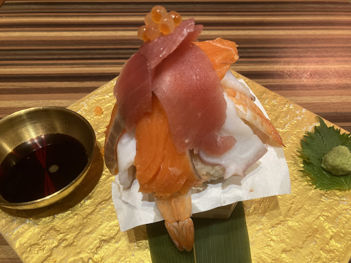 ○海鮮なだれ ちょっとネーミングに誘われ頼んで見た。 ネタとシャリを山盛りにしたお寿司タワーですね。 皆んなで、ワイワイ言いながら食べると楽しいたけ〜