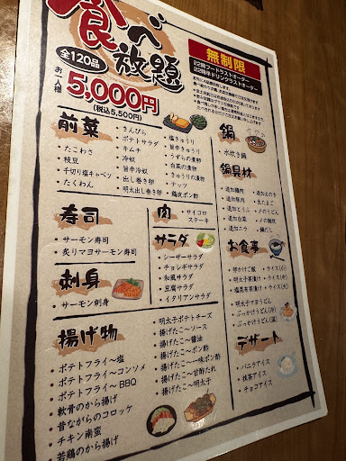 【食べ放題メニュー】 ◆前菜 肉寿司(5貫)/枝豆/たこわさ/冷奴/ポテトサラダ/出汁巻き卵/明太出し巻き卵/明太ポテトチーズ/塩きゅうり/きんぴらごぼう/焼き枝豆/きゅうりの浅漬け/しば漬け