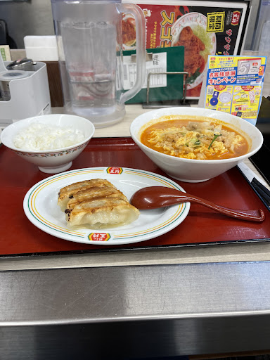Read more甘めの昔懐かしい豚たま麺に辛味。豚辛ラーメン! ご飯餃子のセットで頼むとどーんと調味料。 パリパリジューシー餃子たべて、ご飯片手にラーメンタイム。 たまに立ち寄る高槻でもさらに立ち寄ることは少ないであろう、富田周辺は阪急とJR間にあるので長年気になっていましたが王将制覇のため来店。 店内は広めに席をとっていてとても清潔。オペレーションはとても狭い中で各々の役割がきっちりしていて早くてさすがの王将。 郷愁を誘うくらいのスタンダードゆえに美味しい。油物である豚に甘麺にたまごセットは辛さを包んでくれるので若い方でも食べやすいでしょう。もとの基本が美味しいから辛くしても美味しい。ちょっと行儀悪いですがスープにご飯を匙で入れて食べてみる。具もあるし米に馴染み美味しい。ぱくぱく...