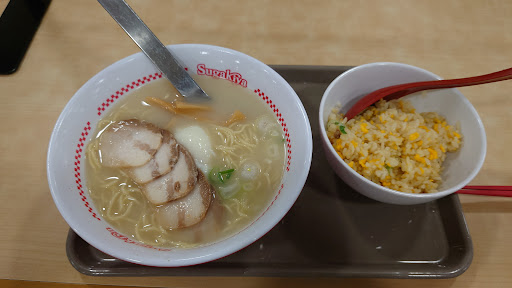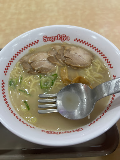 名古屋のソールフードは関西人の私には合わないし(主観ですが味噌煮混みうどん、あんかけスパゲティ、みそかつ、きしめん、他悪ふざけスイーツの数々みんな嫌い)、スガキヤもカウンターの写真をどう見ても美味しそうでないので知っていたものの、長年避けていましたが、それなりに客も付いてて、何よりテナント代が恐ろしく高く維持できずに閉店する店が後をたたない高槻イオンでずっとやってる事だけがどうしても謎で確かめるためについに行きました。 密かな期待は無意味に終わり、想像通りのラーメンでした。430円はクオリティからすると安くなく、トップバリュの袋ラーメンでいいのでリピはありません。こんなに避け続けたことを後悔するほど美味しかったらどうしようという心配は無用でした。長年のモヤモヤがすっきりしました。 変なフォークを横につけずドボンと浸けて提供するとか、やはりこんなのが愛されてる名古屋の文化は理解しがたいです。試したらやはり直感で思った通り使いにくくやけどしたのですぐ...