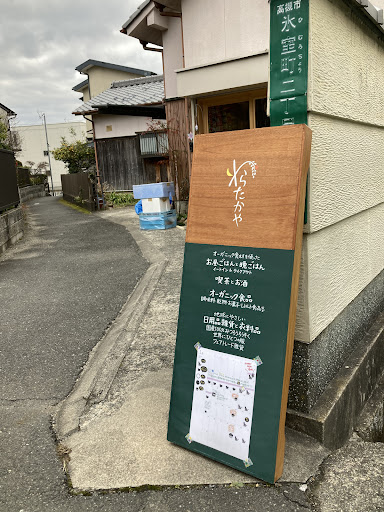 #府立阿武野高等学校前にOPENしていた駄菓子屋もしくは食堂、それとも隠れ家風カフェなのか、パッと見ただけでは分からない『わらたかや』さんに行ってみました。 ここは秋口頃に見つけて、ずっと気になっていたお店でした。 お店のかまえは、民家の納屋か倉を改装したような感じで、入り口付近には様々な自然食品・日用品・雑貨や駄菓子が並んでいます。 その奥にJの字型のカウンターがあります。 お店はご夫婦でやられているとの事。 気さくで明るくとても話しやすい奥さんと、シュッとしてスタイルの良い男前の旦那さんです。 初めて行ったのに1時間以上話し込んでしまいました。 オーガニック食材を使ったお昼ご飯は、めちゃくちゃやさしい味付けなのに、物足りなさはみじんもなくとても美味しくいただけ大満足でした。 とくにお味噌汁が美味しくて、体の中からしっかりとあたたまりました。 院がある宮田町・氷室町地域にまた一軒素敵ない店を発見できて大変うれしく思いました。 ぜひみなさんお店に行かれ...