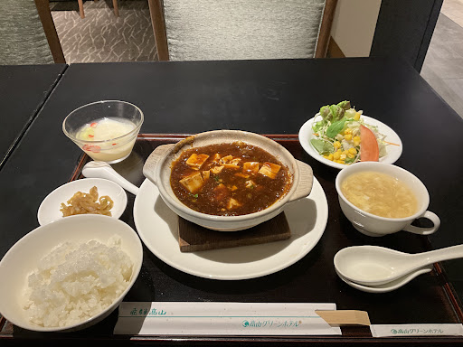 前段は以上の通りであるが、こちらの天京楼さん。 高山グリーンホテルの中にあるレストランだが、実は天京楼さんを含め、このホテル内のレストランは全て良心的な価格となっていることに驚かされる。 土鍋フェアの麻婆豆腐をオーダーしたが、出てくる料理はローズホテルの重慶飯店クラスである。久々にこんなコク辛麻婆豆腐を食べた。 ぐつぐつ煮えて出てくる様は視覚的にも食欲をそそられる。 さらに、点心、サラダ、スープ、ご飯(おかわり自由)、デザートがついて、2000円でお釣りが来る。